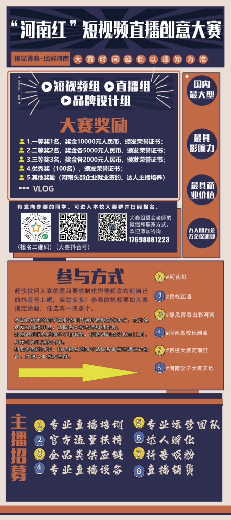 紅了櫻桃,綠了芭蕉,時光是不等人,在我們青蔥歲月里,更應該好好把握時光,為自己的青春留下色彩斑斕的一筆,為了進一步推動以賽促訓,以賽促學,以賽促創,人才培養模式改革,培養一批短視頻,直播,創意設計行業新媒體市場營銷與互聯網創業型人才,推動我省電商行業高質量發展,豫見青春,出彩河南為主題大賽活動已經開始報名,懇請各院部積極動員學生參與,詳情關注開大雙創公眾號、各院門口海報信息或聯系雙創學院周老師,聯系方式17752574409。