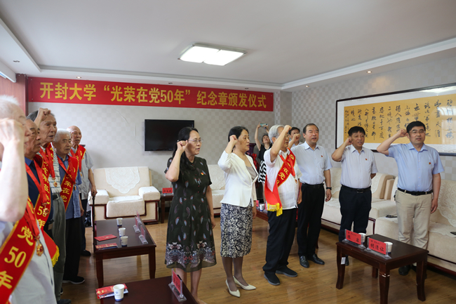 陳燦書記代表學校黨委向獲頒“光榮在黨50年”紀念章的老同志致以崇高的敬意,她指出,各位老黨員“光榮在黨50年”,在黨愛黨、忠誠一輩子,在黨為黨、奮斗一輩子,在黨憂黨、奉獻一輩子,為開封大學教育事業發展作出了重要貢獻,她希望老黨員、老領導、老同志繼續弘揚共產黨人的優良品質,堅持離崗不離黨、退休不褪色,充分發揮政治優勢、經驗優勢、威望優勢,繼續為開封大學教育事業獻計獻策、發光發熱。
