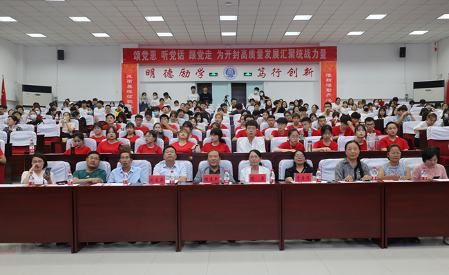 本站訊 6月24日晚,我校在2號樓第一會議廳舉行素質選修課《開封紅色記憶》教學成果展示。校黨委副書記儲建新,校黨委委員、黨委宣傳部部長陳巖,校團委書記劉圣亞出席本次活動,思想政治理論教研部主任常素芳和思政部全體教師參加了本次展示。