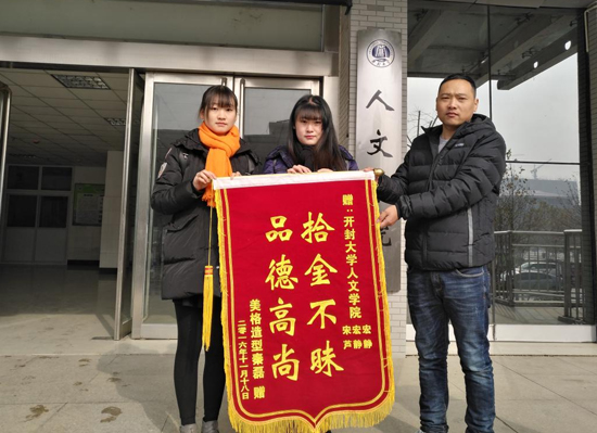 我校人文學院2015級新聞班學生宋宏宏和蘆靜靜與失主合影