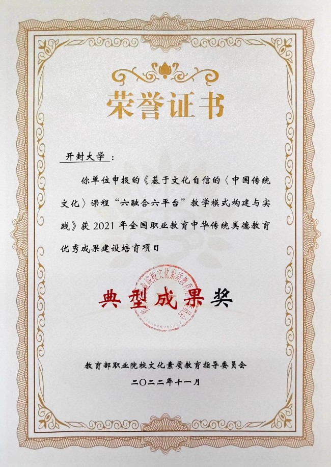 本站訊  近日,教育部職業院校文化素質教育指導委員會公布全國職業教育中華傳統美德教育優秀成果建設培育項目評比結果。我校王茜教授主持申報的《基于文化自信的<中國傳統文化>課程“六融合六平臺”教學模式構建與實踐》項目獲“典型成果獎”。