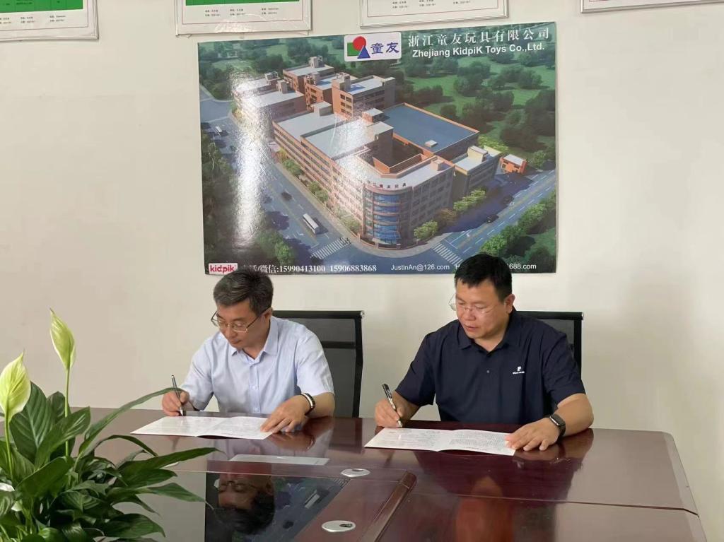 在浙江童友玩具有限公司座談會上,石超亭重點介紹了學校當前面臨的發展機遇以及在專業建設、人才培養、科研創新、社會服務、產教融合、國際交流與合作及校園文化建設等方面取得的可喜成績。企業負責人、我校1996屆校友安世友簡要介紹了企業發展情況,表達了對學校的思念和感激之情,雙方就加強校企合作深入交換了意見,并簽署了校企合作框架協議。