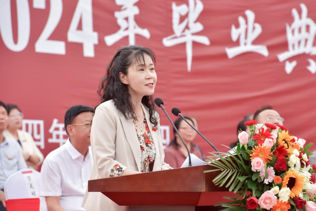 校長王德如代表學校向2024屆畢業生致以最熱烈的祝賀,他總結了近年來學校在立德樹人、教育教學、科研以及社會服務等方面的發展與突破。在即將奔赴祖國各地的時候,王德如對2024屆畢業生寄予了三點深切期望:一是順應大勢,成就大我。號召同學們要堅定不移聽黨話,跟黨走,把小我融入大我,努力書寫愛黨愛國、砥礪奮斗的新篇章。二是堅定務實,創造未來。鼓勵同學們發揚務實精神,把心思和精力用在干事創業上,高質量完成每一項工作任務,在平凡的工作中積蓄能量,讓青春之花盛開得更加嬌艷。三是堅韌不拔,勇攀高峰,期待同學們保持只爭朝夕、奮發有為的姿態和越是艱險越向前的精神,不斷超越自我,取得一個又一個人生巔峰。