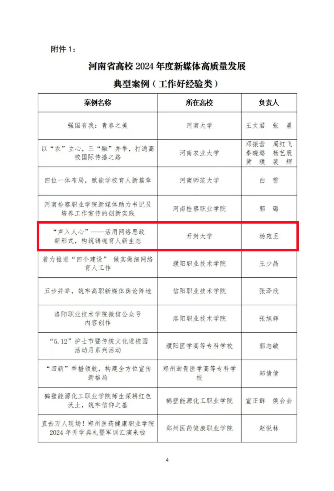 近日,河南省高等教育學(xué)會(huì)宣傳教育服務(wù)中心、河南教育報(bào)刊社融媒體中心公布了《 2024 年度河南省高校新媒體高質(zhì)量發(fā)展典型案例遴選結(jié)果的通知》(豫高教學(xué)會(huì)宣教〔2024〕9號(hào)),開(kāi)封大學(xué)黨委宣傳部楊宛玉老師報(bào)送的《“聲入人心”——活用網(wǎng)絡(luò)思政新形勢(shì),構(gòu)筑鑄魂育人新生態(tài)》榮獲工作好經(jīng)驗(yàn)類(lèi)典型案例,展現(xiàn)了我校在新媒體思政教育領(lǐng)域的卓越成效與創(chuàng)新實(shí)踐。