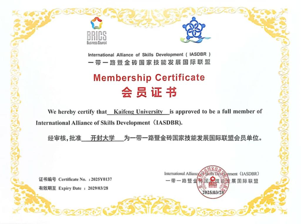 開封大學獲批一帶一路暨金磚國家技能發展國際聯盟會員單位與社會服務專業委員會副主任委員單位
