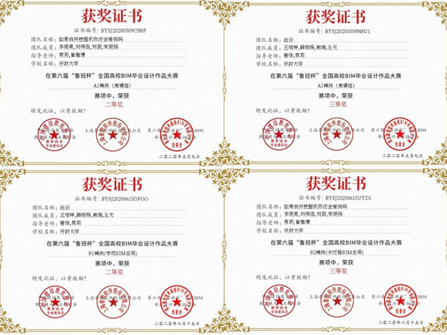 本次大賽由中國建設教育協會主辦,從2019年10月開啟報名到2020年6月決賽,歷時近九個月,共有來自全國本專科高校500支隊伍參賽。經過激烈角逐,由我校土木建筑工程學院常莉、崔雅博老師指導,17土木李昆亮、劉蕓、劉偉浩、16土木宋昆揚同學組成的團隊榮獲A1模塊(房建組)二等獎、B2模塊(全過程BIM應用)三等獎。由曾佳、常莉老師指導,18土木王培坤、薛雨楊、謝湘、左天同學組成的團隊榮獲A1模塊(房建組)三等獎、B1模塊(專項BIM應用)二等獎。