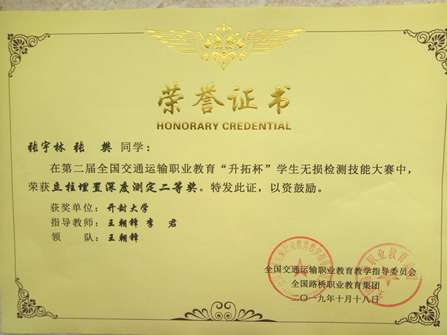 近日,第二屆全國交通運輸職業(yè)教育“升拓杯”學生無損檢測技能大賽”在遼寧省沈陽市交通高等專科學校落下帷幕,經過幾天激烈角逐,我校土木建筑工程學院王朝鋒、李君老師指導的道路橋梁工程技術專業(yè)學生張宇林、張樊取得立柱埋置深度測定項目二等獎。