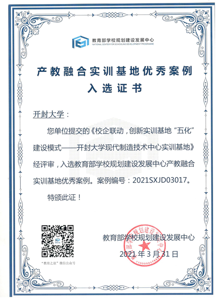 活動開展以來,我校高度重視、強(qiáng)化管理、狠抓落實,積極開展申報。最終,我校《校企聯(lián)動,創(chuàng)新實訓(xùn)基地“五化”建設(shè)模式——開封大學(xué)現(xiàn)代制造技術(shù)中心實訓(xùn)基地》案例從全國眾多案例中脫穎而出,成功入選教育部產(chǎn)教融合實訓(xùn)基地優(yōu)秀案例。