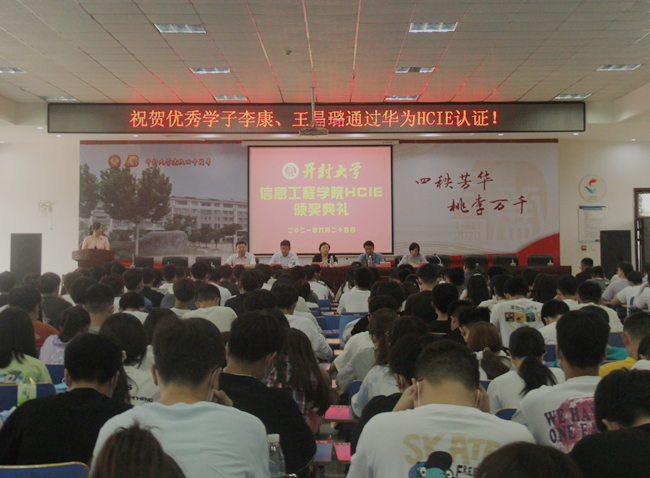 本站訊 6月24日下午,我校信息工程學院HCIE頒獎大會在土木建筑工程學院六樓報告廳舉行。華為政企業務部開封總經理楊昊,校黨委委員、副校長趙輝出席了大會,教務處處長馮天才、信息工程學院黨總支書記袁震、院長楊樺等領導和信息工程學院全體教師和各專業學生代表300余人參加了大會。大會由信息工程學院副院長李響主持。