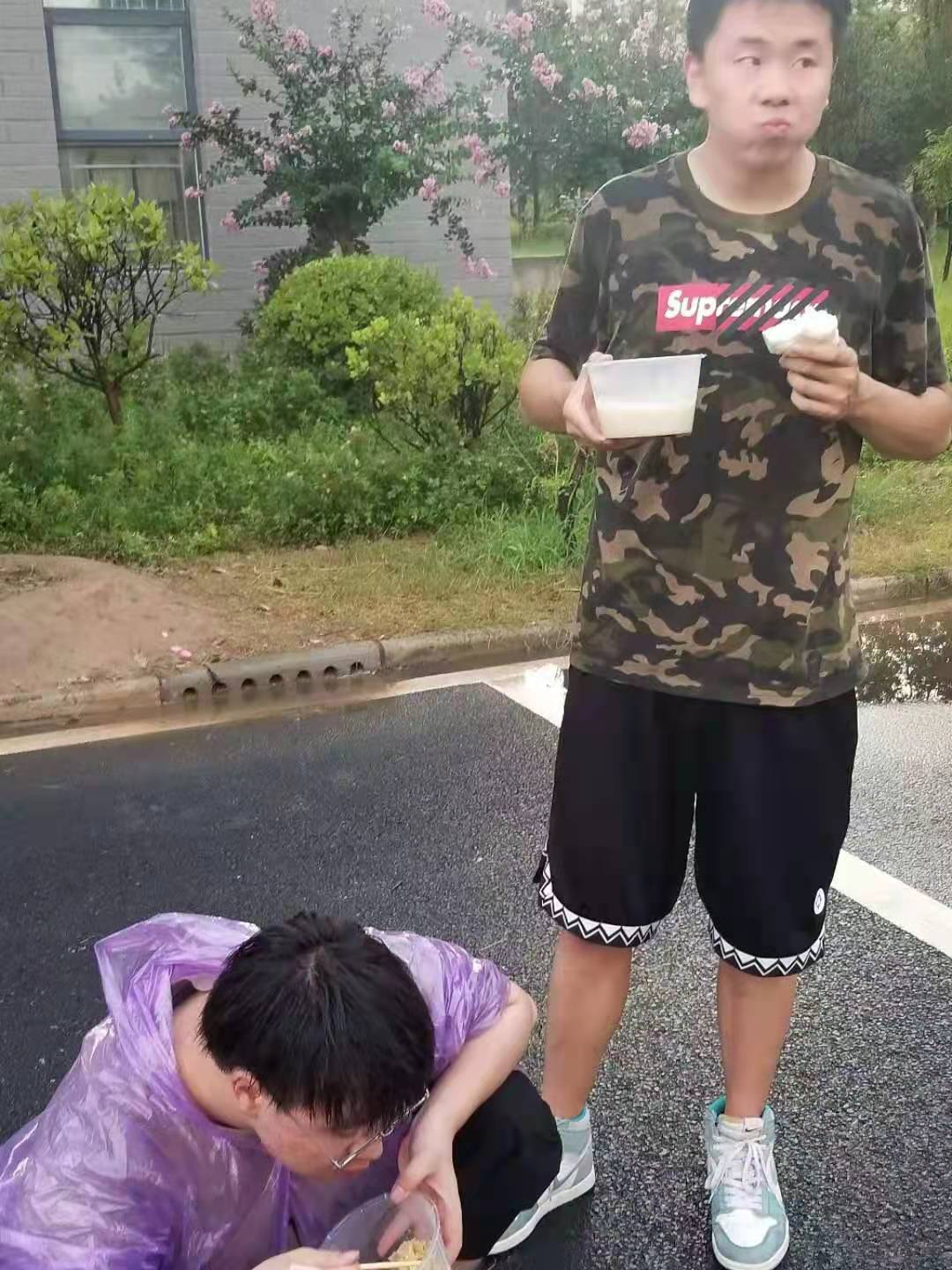 陶治名同學(xué)在雨中與同學(xué)一起席地就餐,任勞任怨