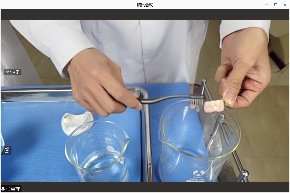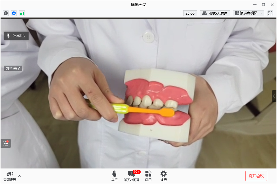 在我校綜合樓四樓口腔實驗室的直播現場,科普團隊借助一個普普通通的就醫場景,氣氛輕松、生動幽默的分享了適用于老年人、成年人的“改良bass刷牙法”,活動義齒清潔方法,以及適用于兒童的“圓弧刷牙法”。